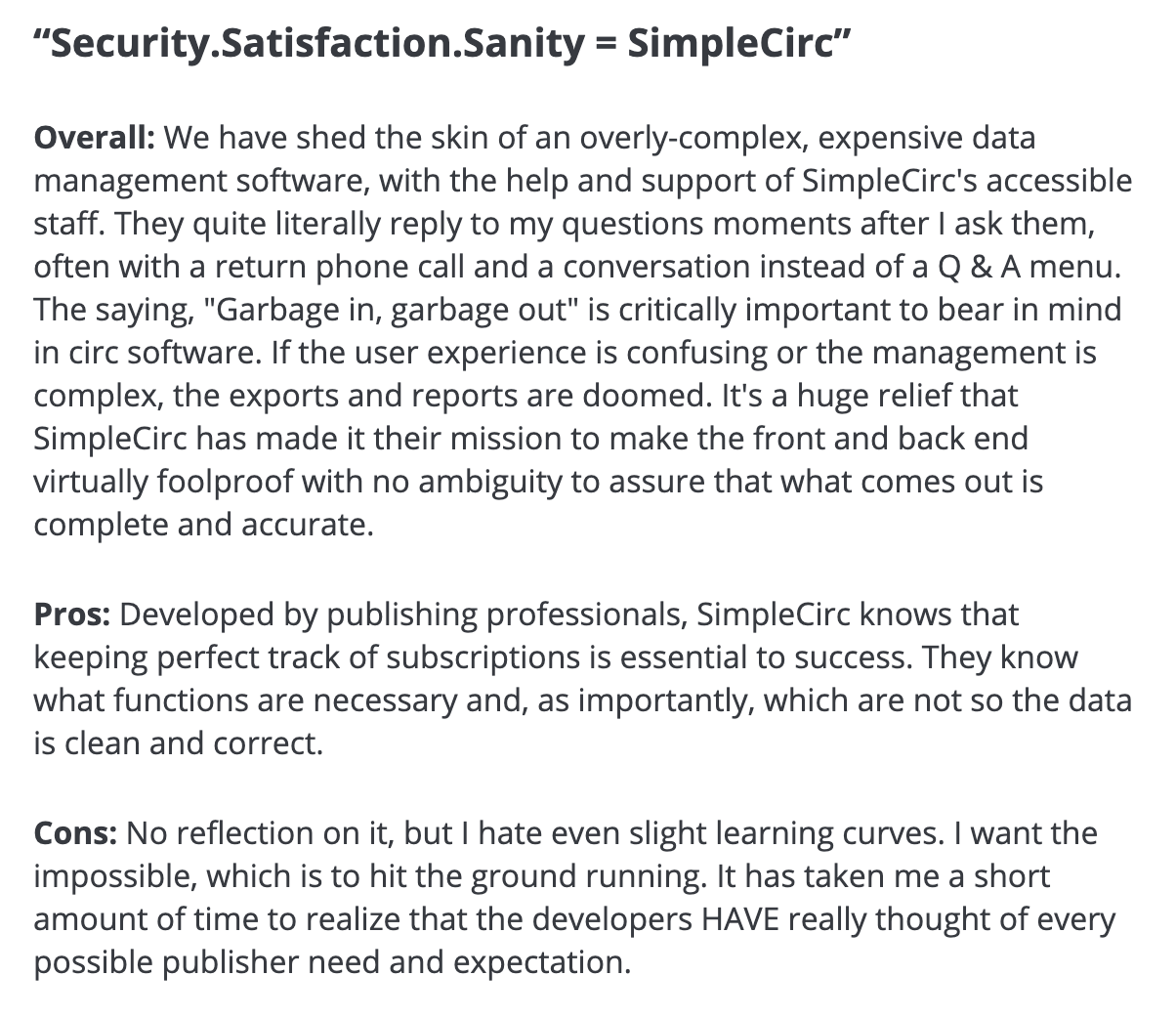 “The cloud-based SimpleCirc software really lived up to its name. … Easy to learn and teach others to use, it doesn’t have a bunch of options that you’ll never use, and a number of options that you’ll love to use.”
